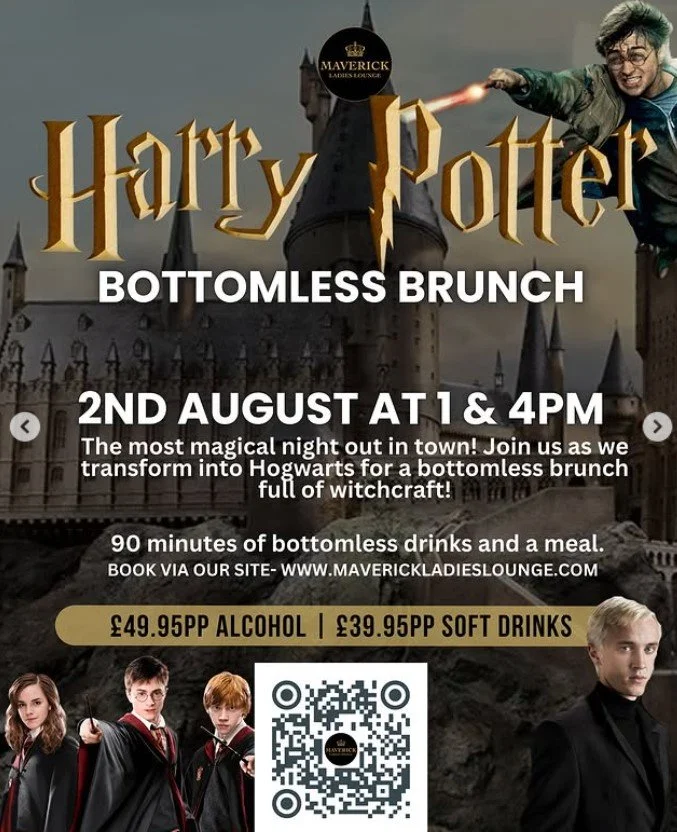 Harry Potter themed bottomless brunch event poster featuring Hogwarts castle, the Harry Potter logo, and characters resembling Harry Potter, Hermione Granger, Ron Weasley, and Draco Malfoy, with event details including date, time, pricing, and a QR code for booking.